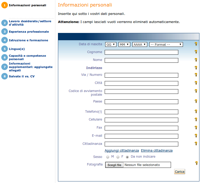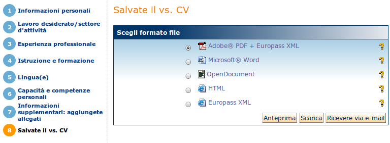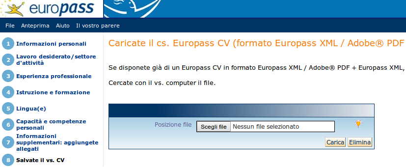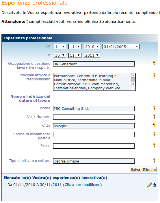 Il Curriculum Vitae in formato Europeo, generalmente, non è amato dagli addetti alla ricerca e selezione del personale. Tuttavia, alcune agenzie interinali, così come alcune aziende che partecipano a gare pubbliche, richiedono esplicitamente ai candidati il CV in formato europeo. È quindi consigliabile avere il proprio cv in due formati: uno in formato “personale” e un altro in formato europeo. Per poter creare velocemente il CV europeo, è possibile utilizzare un tool online sul sito di Europass. Cliccando sul link vi ritroverete in questa pagina: Cliccate sull'opzione “Crea il tuo CV on-line” per iniziare con la compilazione del CV europeo. Si aprirà una nuova pagina: Il menu verticale a sinistra vi consente di navigare tra le varie sezioni del cv che vorrete compilare. Se avete dubbi sull'utilizzo di un campo, cliccate sul “?” per una guida rapida. Il CV Europeo è noto per la sua complessità e per la presenza di innumerevoli campi. Non preoccupatevi di compilare ad ogni costo tutti i campi in quanto quelli lasciati vuoti non compariranno nel documento finale. Es. Compilazione delle Esperienze professionali Tramite il menu verticale a sinistra portatevi nella sezione “Esperienza professionale”. Inserite una prima esperienza professionale e poi cliccate su “Salva” in basso a destra: Salvando, il form tornerà vuoto e potrete inserire una nuova esperienza. Una volta inserita una seconda esperienza, potrete ordinarle tramite le freccette nel riepilogo in basso, partendo dalla più recente: Ritroverete questa modalità di compilazione anche per la sezione “Istruzione e formazione”. Compilate le sezioni di vostro interesse e andate su “Salvate il vs. CV” dal menu a sinistra: Vi consiglio di scaricare il CV Europeo sia in Pdf, sia in Word. Come aggiornare e modificare un CV europeo già creato in precedenza Per aggiornare o modificare il vostro CV, non dovrete far altro che tornare sul link di Europass e cliccare su “Aggiorna il tuo CV (PDF + XML) on-line”: Scegliete e caricate il PDF salvato in precedenza. In questo modo caricherete nelle varie sezioni del CV Europeo le informazioni già inserite e potrete procedere con le modifiche.